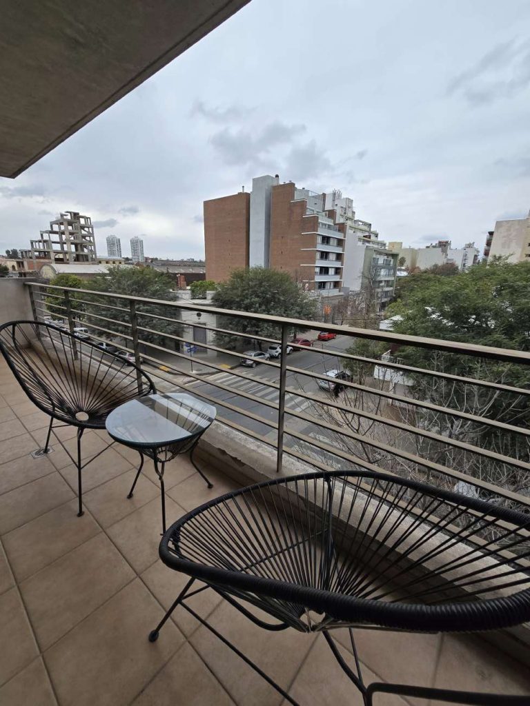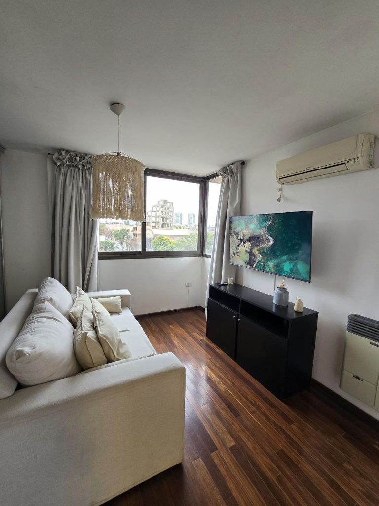 Departamento ubicado en Calle Catamarca 1096, de Barrio General Paz. Cuenta con comedor amplio con mesa y 4 sillas de madera, living con sofá cama y Smart TV, puerta ventana corrediza que lo vincula a balcón externo, espacio de distribución y cocina integrada, totalmente equipada. Baño con todos sus sanitarios, ducha con bañera, habitación de buena dimensión con placard empotrado con puertas corredizas. Pisos de parquet living/comedor, equipos de Aire Acondicionado y calefacción de tiro balanceado.La orientación frente le brinda mucha iluminación a todos sus espacios.